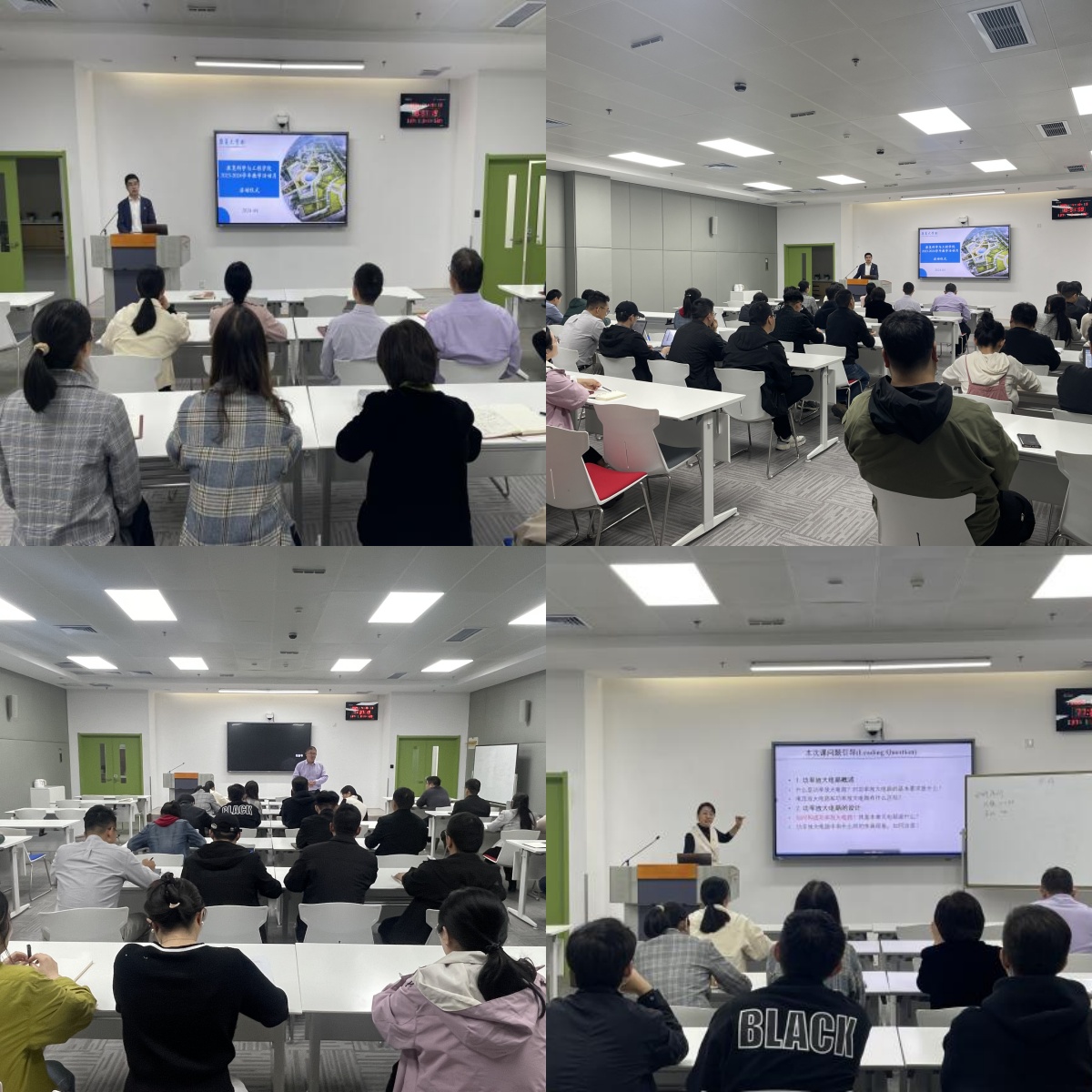 启动仪式后,王贞老师为学院教职工开讲第一课。王贞老师以“线性电子线路”中“功率放大电路”为主题,通过生动的实例和富有启发性的问题,引导学生深入理解功率放大电路的基本要求和设计实现。王贞老师首先以生活实例导入,创设情境激发学生学习兴趣,迅速进入课程;然后以问题驱动,采用启发式、“拟人法”、对比法等讲解基本概念和性能指标;接着以功放指标要求为主线,按照持续改进的思路,逐步完成功率放大电路设计思路的讲授,在此过程中,着眼于不同指标要求间的矛盾,研究电路的利弊关系,引导学生学会全面分析解决问题,启发学生建立辩证思维方式;结合仿真实例对重点问题进行演示,利用视听冲击加深学生对重点理解和掌握;最后通过实例和研究进展培养学生自主学习和查阅文献的能力,利用实物展示激发学生探索新知的好奇心,体现课程的延展性。示范课上,王老师巧妙地将传统教学与现代信息技术结合,利用“雨课堂”、多媒体工具和板书多种形式展示了放大电路的设计和改进,使抽象的知识变得直观。在整个教学过程中,王老师坚持“以学生为主体,教师为主导”的教学理念,贯彻“面向问题,面向应用”的研究性教学核心,精心设计教学环节,体现“知识增长”,逐层深入,真正做到了启发式教学。