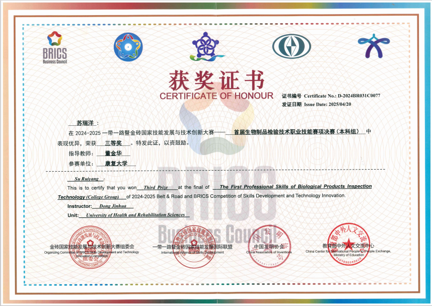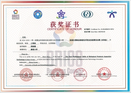 4月18日至21日,2025“一带一路”暨金砖国家技能发展与技术创新大赛首届生物制品检验技术赛项全国总决赛在暨南大学举行,我校大一学生代表首次参赛便取得优异成绩,作为整场赛事仅有的两位一年级学生,收获两枚奖牌。
