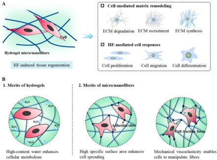 图1.水凝胶纤维促进组织修复的优势:(A)细胞-基质相互作用机制;(B)水凝胶纤维对细胞功能的调控作用