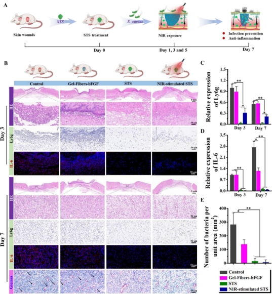 图2.NIR光激发STS促进感染创面的功效:(A)7天治疗过程中实验设计示意图;(B)H&E、Ly6g、IL-6及吉姆萨染色结果;(C-E)Ly6g和IL-6表达量、细菌定量分析。