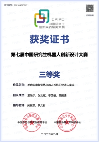 10-14我院周平团队吴林彦指导的研究生团队在第七届中国研究生机器人创新设计大赛中,凭项目《手功能康复训练机器人系统的设计与实现》获得三等奖(2025年9月)。参赛团队成员为王浩宇、张文斌、李四楠、田茹锦、吴林彦、李尤君。该项目围绕上肢手功能康复训练的实际需求,完成了从方案设计到样机实现的验证。系统在训练流程、人机交互与基础安全策略方面进行了针对性设计,重点关注可用性与稳定性,并通过小规模功能性测试完成初步验...