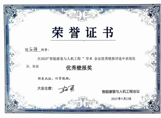 06-10我院周平团队研究生田茹锦在周平、路知远等人的指导下,凭借出色的研究展示,在5月25日举办的“智能康复与人机工程”学术会议上荣获优秀壁报奖。会议聚焦智能康复技术与人机工程融合前沿,田茹锦的壁报围绕相关研究展开,以清晰逻辑、创新内容,展现对智能康复领域的探索。经大会评审,其壁报在众多作品中脱颖而出,获“优秀壁报奖”荣誉。此次获奖,是田茹锦科研能力的体现,也彰显其在智能康复与人机工程交叉领域的研究潜力,...